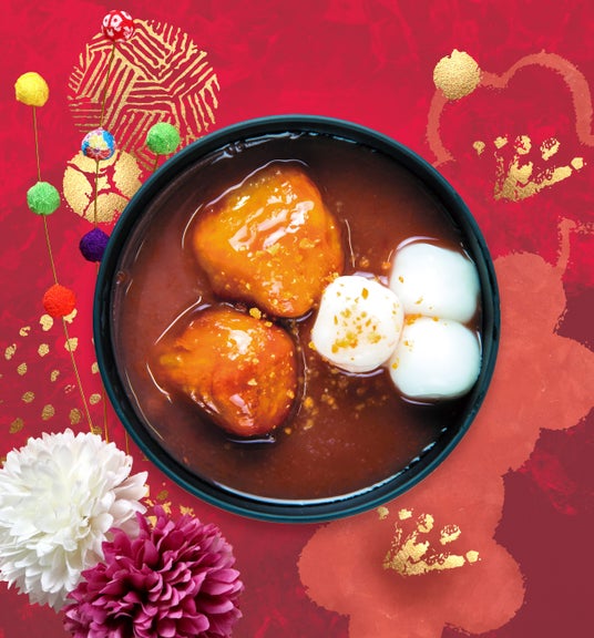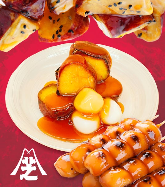 あまじょっぱい暖か「みたらし」を、表面カリッと揚げた焼き芋と白玉にからめました。揚げ焼き芋の意外な食感とみたらしの相性は云うまでもないうまさ。