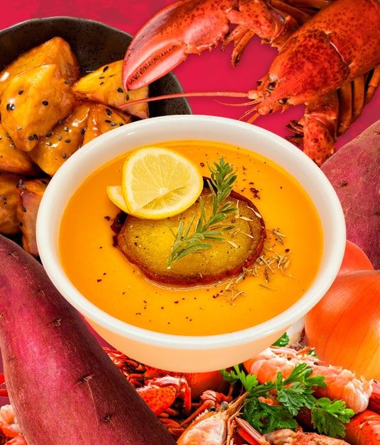 オマール海老をつかった海老のビスク。揚げた焼き芋をビスクにいっしょに口に運べば、外はサクッと中はとろりジューシーなマリアージュ。