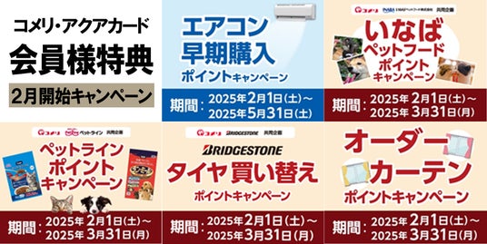 ホームセンターの「コメリパワー」や「コメリハード&グリーン」を通し地域のライフラインであり続けたいと願う株式会社コメリ(所在地:新潟県 新潟市、代表取締役社長:捧 雄一郎)は、コメリの決済手段「コメリカード」「アクアカード」会員様特典として、2025年2月から5種のキャンペーンを新たにスタートいたしました。
