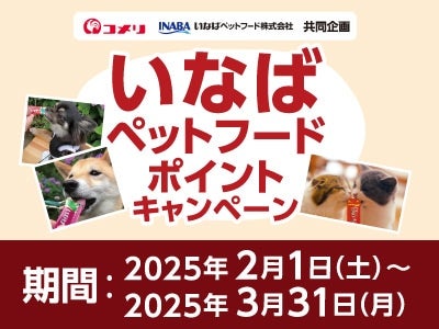 コメリ・いなばペットフード 共同企画「いなばペットフードポイントキャンペーン」条件・賞品:期間中、コメリのアプリからエントリーし、対象のいなばペットフード商品を同日同店舗でお買い上げ税込2,500円を1口として、もれなく500ポイントプレゼント。