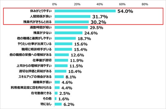 5.満足していることの上位は「休みがとりやすい(54.0%)」、「人間関係が良い(31.7%)」、「残業代がきちんと出る(30.2%)」