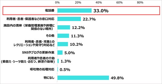 本来業務以外の業務は「電話番(33.0%)」、「利用者・患者・保護者などの窓口対応(22.7%)」、「施設内の清掃(栄養管理業務や調理に関係のない場所)(12.2%)」が上位。