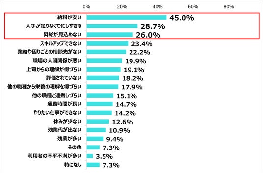 満足していないことの上位は「給料が安い(45.0%)」、「人手が足りなくて忙しすぎる(28.7%)」、「昇給が見込めない(26.0%)」となった。