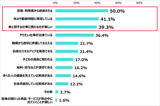 やりがいを感じていることの上位は「患者・利用者から感謝される(50.0%)」「休みや勤務時間に満足している(41.1%)」「食に関する仕事に携わるのが楽しい(39.3%)」だった。