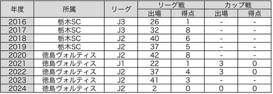 益子SCストラーダ - JEF宇都宮 - 鹿島学園高校 - 流通経済大学 - 栃木SC - 徳島ヴォルティス■出場記録