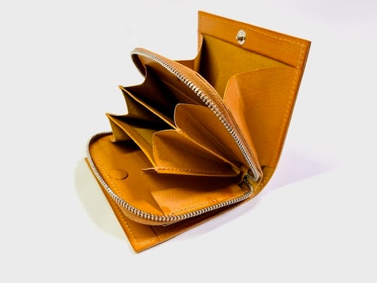 蛇腹のような側面は、扇や折り紙を彷彿とさせますね。手のひらサイズのコインケース外側には紙幣収納スペースを(左右フラップ式)設け、紙幣を折らずに収納可能なデザインになっています。