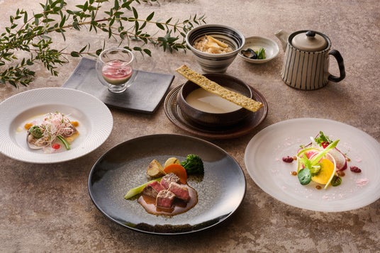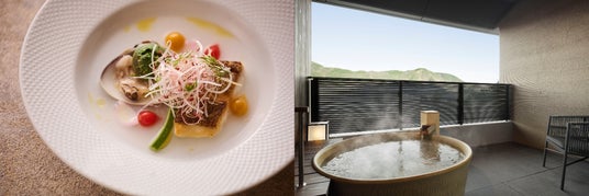 本プランは、ディナーの乾杯に桜ワイン、湯上りに桜風味の和菓子をご提供し、翌日のチェックアウト時に花見のおとものテイクアウトフードをお渡しする、ホテル内外で桜を満喫する宿泊プランです。ディナーは箱根外輪山の山並みを眺めるレストランで、春の訪れをテーマにした、和の趣きと洋のスタイルが融合したフュージョンフレンチをご提供いたします。乾杯には、この季節にぴったりの桜ワインをご用意。ふわっと桜の薫るワインともに、甘エビを醤油こうじやレムラードソースと合わせてお召し上がりいただく前菜などをお楽しみください。ご滞在は本館の温泉露天風呂付客室や、綾館のテラスと温泉露天風呂付客室でお過ごしいただけます。また、湯上りには客室でお召し上がりいただく地元和菓子店の強羅花詩の練り切り菓子「富士箱根」をご用意いたします。さらに、翌日のチェックアウト時には和牛のしぐれ煮や春野菜、3色のご飯で彩りも良い海苔巻きや桜海老をあしらったいなりずしのお弁当をお渡し。いなりずし片手に宮城野早川沿いや恩賜公園などの箱根桜スポットで、お花見をお楽しみいただけます。