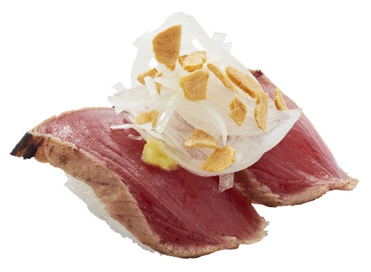 かつおたたきの定番!ガーリックチップとオニオンスライスをトッピング。