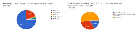 本企画では、楽しみながら海岸清掃を行ってもらえるよう、海洋ごみにまつわるクイズが書かれたチェックポイントを田ノ浦ビーチに4か所設け、回答を頂けた方にオリジナルサコッシュをプレゼントしました。参加者の皆様の回答(n=127)の結果では、平均の正答率は75%(全4問中3問正解した方)と高く、企画後の海洋ごみへの関心についてヒアリングした項目では、93.7%の方がポジティブな回答(「高まった」「少し高まった」と回答した方の割合)を頂きました。またCHANGE FOR THE BLUEの認知度では約半数の方が知っているという結果となりました。当企画を通じて、参加者の皆様の海洋ごみ問題に対する気付きの機会を提供できたのではと自負しております。今後も様々な取り組みを通じて、CHANGE FOR THE BLUEのプロジェクトや、大分県内での我々の活動、ひいては海洋ごみ問題についての認知向上・自分事化に繋げたいと考えております。