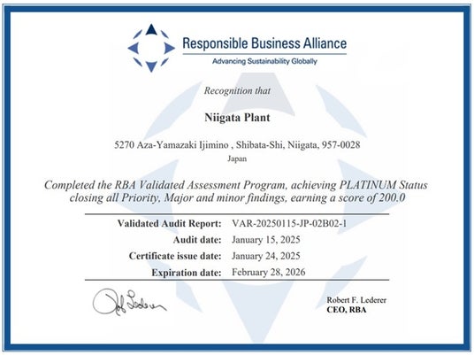 新潟工場では、グローバル市場に向けた先端エレクトロニクス製品の生産拠点として、サプライチェーンの持続的な改善に取り組んでいます。その結果、労働、安全衛生、環境、倫理、サプライチェーン管理の各監査項目において、最高得点の200点満点を獲得してプラチナ・ステータスを取得し、顧客からのRBA行動規範準拠の要望に対し高いコミットメントを示すことができました。