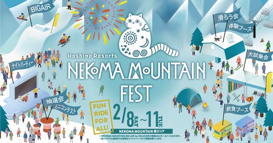南北に広がる壮大なフィールドをもつスキー場「星野リゾート ネコマ マウンテン」は、2025年2月8日~11日の4日間、雪上のお祭り「NEKOMA MOUNTAIN FEST」を開催します。ゲレンデ全体を使い、スキー・スノーボードの試乗会、会津地域の魅力を楽しめるブース出店、ナイトパーティーなどを行います。また、スノーボードのビッグエア大会も同時開催しており、トップアスリートの戦いを観戦できます。「滑って楽しい、遊んで楽しい、観て楽しい」誰でも楽しめる4日間のお祭りです。