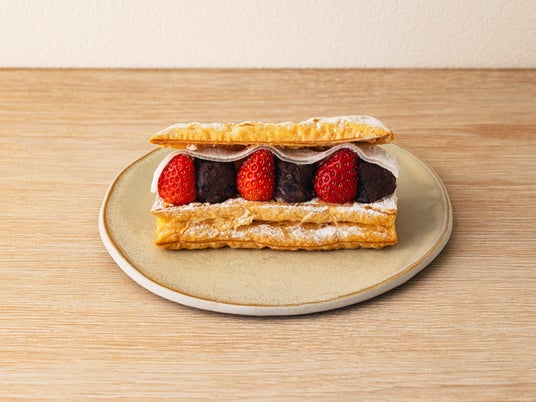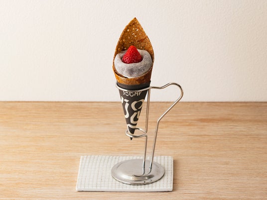 そば粉のミニクレープで、和×洋テイストがコラボしたいちご大福を丸ごと包んだ、見た目もごちそうな一品。求肥でスッキリした甘さの粒あんと生クリーム、ほろ苦の生チョコレートを包み、いちごを丸ごと1個トッピング。しっとりしたクレープ生地と一緒に食べれば、もちっと食感とともにそば粉の風味も感じられます。