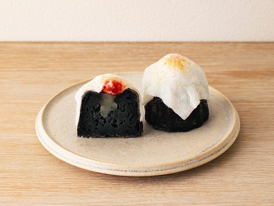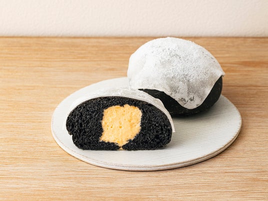 見た目のインパクトのある、真っ白なおもちをまとった真っ黒な竹炭パン。竹炭パウダーを練り込みふんわり焼いたパンの上に、パウダーシュガーをまぶした求肥をのせました。中にはバニラビーンズの香りが広がる、自家製の生カスタードクリーム入りです。