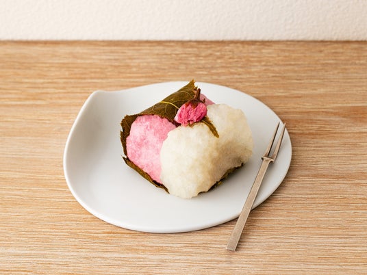 手の平に収まる小ぶりなサイズに、2色の桜餅が合わさった贅沢な一品。赤はこしあん、白は白あん、2種類の味を同時に楽しめる贅沢な道明寺です。桜の葉と花の塩漬けが添えられ、もち米の優しい甘さ、あんの上品な甘さ、桜の塩漬けの塩味がハーモニーを奏でます。