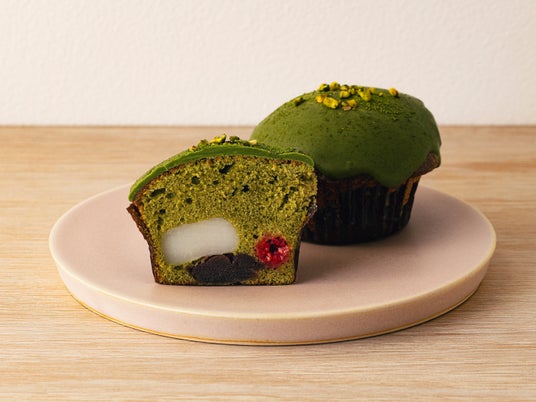 日本茶にも紅茶にも合う和洋折衷のマフィンが登場。生地に抹茶を練り込み、表面を抹茶チョコレートでコーティング、さらに上から抹茶パウダーを振りかけた抹茶づくしの一品。中には白玉とこしあん、アクセントにラズベリーを忍ばせ、リッチな味わいに仕上げました。※数量限定:1日30個