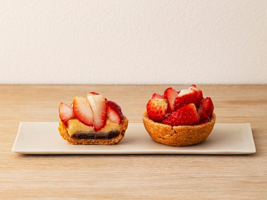 米粉を使ったパリカリな新食感タルトと、イチゴ大福の食感の違いが楽しめるタルト。タルト専門店が手がける米粉の和風タルトは、新潟県で自然栽培された米粉を使うことで、小麦粉のサクサクとは異なる新食感に仕上げています。そこに、粒あん、求肥、カスタードクリームを重ね、最後にイチゴをたっぷりトッピング。※販売時間:11:00~なくなり次第終了