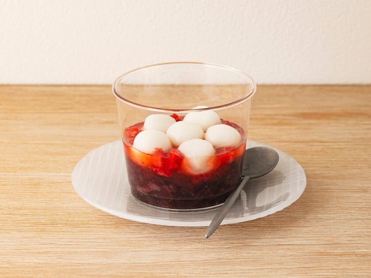 優しい甘さの小豆にいちごソースを合わせた、ひんやり白玉のおしるこです。上品な甘さで小豆の風味が活きたおしること、甘酸っぱいいちごのソースは、白玉と相性ぴったり。船橋屋の無添加自然発酵くず餅から生まれた植物性乳酸菌も入っています。