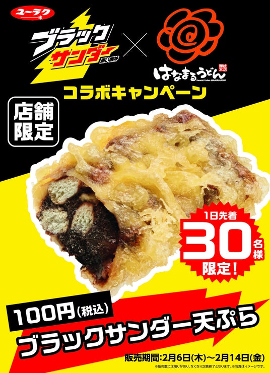 2025年2月14日(金) バレンタインデーに、全国(※一部店舗除く)のはなまるうどんにて、味噌バターフェアうどん(一部店舗ではフェア商品が異なります)をお買い上げいただき、はなまる公式アプリ画面をご提示いただいた方、各店先着20名様に、はなまるオリジナル バレンタインコラボパッケージのブラックサンダーをプレゼントいたします。また、2月6日(木)より2月14日(金)まで、はなまるうどん10店舗で、ブラックサンダーを天ぷらにした「ブラックサンダー天ぷら」を期間中毎日、各店30名様限定で販売いたします。