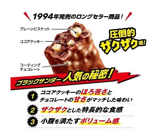 1994年に誕生したチョコレートバーです。2024年9月に30周年を迎え、ブラックサンダーの特長である「圧倒的ザクザク感!」がパワーアップ!従来のココアクッキーをよりハード食感にした新しいココアクッキーを配合。食感の異なる2種のココアクッキーとプレーンビスケットが生み出す進化した「圧倒的ザクザク感!」をお楽しみください。