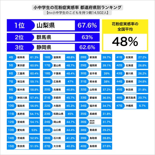 -小中学生の花粉症実感率1位山梨県67.6%、2位群馬県63.0%、3位静岡県62.6%