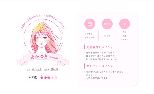 さらに今年は、福島で約60品種生産されている桃の中から、福島を代表する桃の8品種を擬人化。あかつきや川中島白桃などキャラクター化された“桃娘”たちが、収穫時期や味わい、レア度、おすすめポイントなど桃の特徴をPRします。