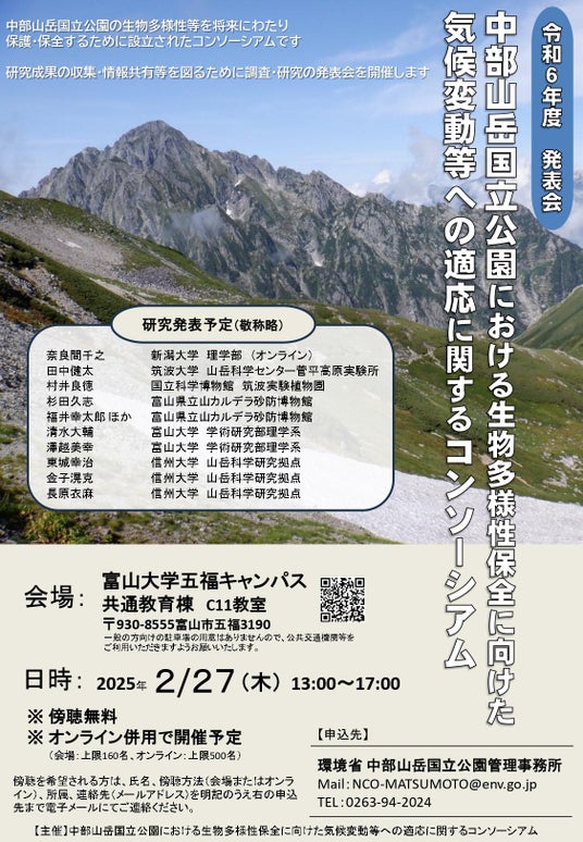 「中部山岳国立公園における生物多様性保全に向けた気候変動等への適応に関するコンソーシアム」の令和6年度の発表会を開催しますので、お知らせします。