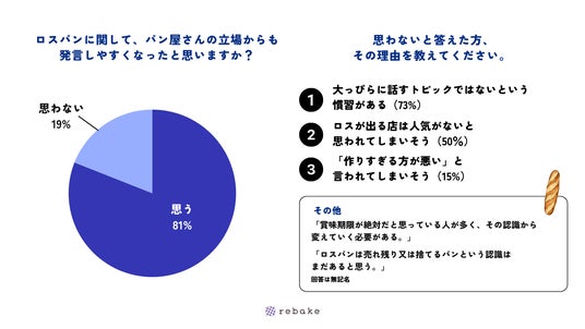 rebakeの調査によると、パン業界全体で、食品ロス削減の意識が高まっていると感じるパン屋さんは93%に上ります(参考1)。rebakeなどの食品ロス削減をサポートする企業が増えたことや、パン屋さん内部でもパンを捨てる際の精神的負担を減らそうという動きがあることがわかりました。一方で、ロスパンに関して、パン屋さん側からも発言しやすくなったかという質問に対し、81%が「思う」、19%が「思わない」と回答しました(参考2)。この結果だけ見ると、大多数のパン屋さんが発言しやすくなったように感じているように思われますが、ひとつ前の、パン業界全体の食品ロス削減への意識の高まりを考慮すると、意識の高まりに対して、発言のしやすさはあと一歩追いついていない印象です。その理由としては、「大っぴらに話すトピックではないという慣習がある」と感じているパン屋さんが多いことが挙げられました。