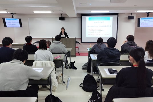 講座内では、田巻氏から「伝わる」ことを意識した話の組み立て方からビジネスマナーにおける想像力の大切さ、相手・場面・自分の立場を踏まえた職場でのコミュニケーションなど、社会人として一歩リードできるスキルや持つべき心構えを中心とした内容をお話しいただきました。
