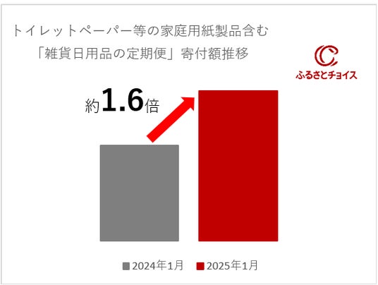 2025年1月は、トイレットペーパーやティッシュペーパーなどの家庭用紙製品を含む「雑貨日用品の定期便」への寄付額も増えており、昨対同期比で1.6倍に増加しています。家庭用紙製品への寄付も物価高騰が影響しており、地域への支援と同時に家計への助けとしてふるさと納税が活用されています。