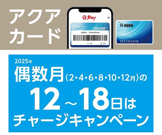 ホームセンターの「コメリパワー」や「コメリハード&グリーン」を通し地域のライフラインであり続けたいと願う株式会社コメリ(所在地:新潟県 新潟市、代表取締役社長:捧 雄一郎)は、コメリのチャージ式プリペイドカード「アクアカード」会員様向けに、「アクアカードチャージキャンペーン」を2025年、偶数月の12日~18日の7日間、開催いたします。