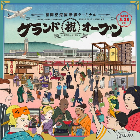 - 浮世絵イラストレーター「NAGA」氏を採用し、国際線の風景や飛行機、福岡で楽しく過ごす人々を和装で描く