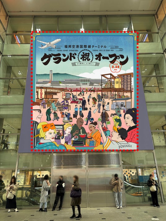 - キービジュアルは浮世絵イラストレーター「NAGA」氏によるイラストです。新免税店のランドマークとなる大型櫓や賑やかな屋台街をイメージしたフードコートなど、リニューアル後の福岡空港国際線やそこで楽しく過ごす人々を浮世絵イラストで描くことで、海外の方にもわかりやすく、日本人には印象に残るビジュアルにしました。