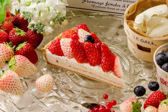 色鮮やかなイチゴの中に甘く濃厚な香りの白イチゴを飾った華やかなタルトです。さわやかな酸味のイチゴピューレを“ル ガール”クリームチーズに混ぜあわせ、まろやかな味わいのムースに仕上げました。バター風味豊かなパイ生地とイチゴの組み合わせをお楽しみください。
