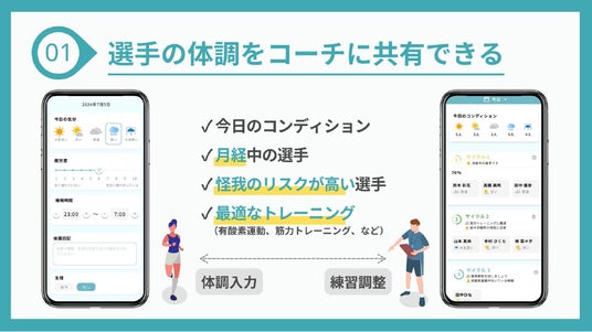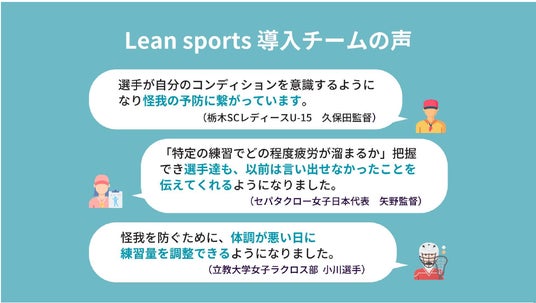 Lean sportsは、女子スポーツチームのパフォーマンスを最大限に引き出すために開発された、コンディション管理アプリです。 選手の月経を含む体調情報をコーチに共有でき、怪我のリスクを早期に把握できます。 さらに、選手が入力したデータをもとにAIが個別に体調管理に役立つアドバイスを提供し、選手のヘルスリテラシーの向上をサポートします。