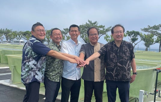 ▲「琉球あおのり」の伊江島陸上養殖場の落成式にパルシステムも駆けつけ地域振興を応援