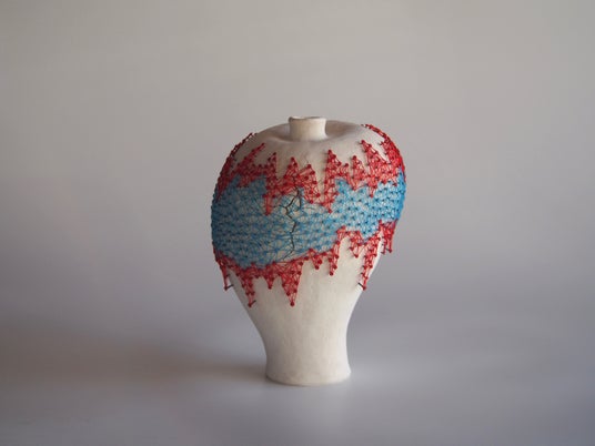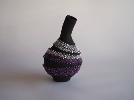 大胆にもあるべきうつわのかたちが崩れ、そのカタチに重ねるように、繊細な鋲の並びと張り巡らされた糸がその名の通りオートクチュールのドレスのように仕立てあげられるさまには、ハッとさせられまます。うつわという万人に対して機能する要素をあえて取り除き、 すこし寂しげな表情を見せる陶の、もはや塊に対して、新たな美の価値を纏わせる。それは少し複雑怪奇な行為ともいえます。