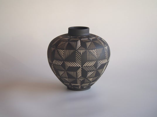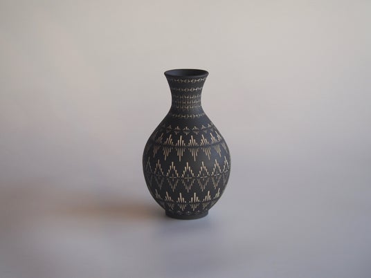 幾何学的に計算された文様がストイックに陶に彫り込まれた作品。それは肌に祈りを込めて刻むような神聖なタトゥーの趣のようであり、ごくシンプルな器の造形を尊重しながら、土への敬意であると思え、先述のDressにも共通していえる、本来土という素材の持つ美を呼び起こすような神聖な儀にも思ます。