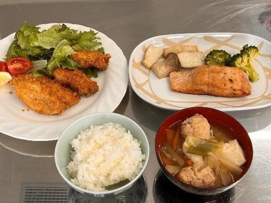 一生懸命魚をさばいた後は、子どもたちが「鮭のバター焼き、鯵フライ、牡蠣フライ」と盛りだくさんのメニューを料理!さらに、先生が手作り味噌を使用した郷土料理の「鮭のつみれ汁」を調理してくれました。