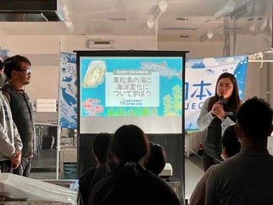 はじめに、漁業や農業を営みながら、次世代に自然の生きる力を伝える活動を行っている一般社団法人ODYSSEYの方々が「東松島の海と海洋変化について」の授業を行い、近年、地球温暖化による海面水温の上昇が影響し、宮城県内の「鮭」の来遊がピーク時の約350万匹から約5万匹に激減していることや、昨年、シロボヤが大量発生したことが原因で牡蠣が大きく育たない問題など、地域の海洋変化による漁業の現状を学びました。