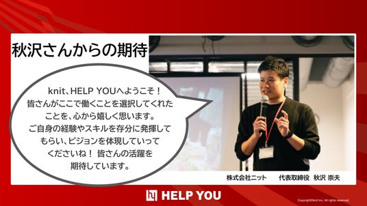フリーランスという働き方は、「未来を自分で選択できる社会をつくる」という当社のビジョンを実現するための手段の一つです。しかし、フルリモート環境には孤独を感じやすいという課題もあります。そこでHELP YOUでは、メンバーが孤独を感じることなく働けるよう、積極的にサポートを行っています。今回の歓迎レセプションをはじめ、定期的にさまざまなオンラインイベントを企画し、コミュニケーションの場を提供しています。