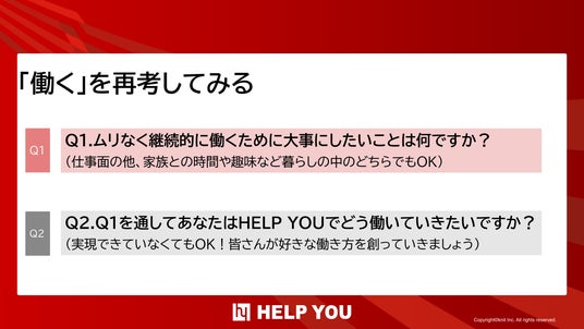 自分自身が「働く」ことについて改めて深堀りすることは、今後自分が幸せに働いていくためにも大切です。ここで話したことや聞いたことを思い出しながら、「働く」を通じて、自分自身が幸せになり、さらにその輪が広がっていくことを願っています。
