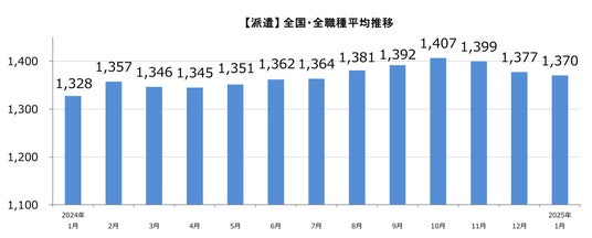 【派遣】全国・全職種平均時給は1,370円。前月比-7円。前年同月比+42円