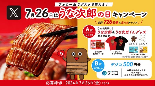 ご応募いただいた方の中から抽選で、オリジナルうな次郎くんグッズやお好きなポイントやギフト券に交換できるデジコを 7 月26 日の「うな次郎の日」に合わせて合計 726 名さまにプレゼントします。