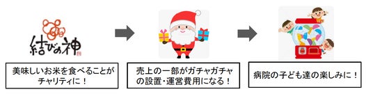 チャリティ米「結びの神」の売上の一部が「ガチャガチャプロジェクト」の 運営資金となります。 単なる寄付活動では無く、寄付者が好むモノを購入し、楽しむことで自然とチャリティに参加出来てしまうというWIN-WINの仕組み。