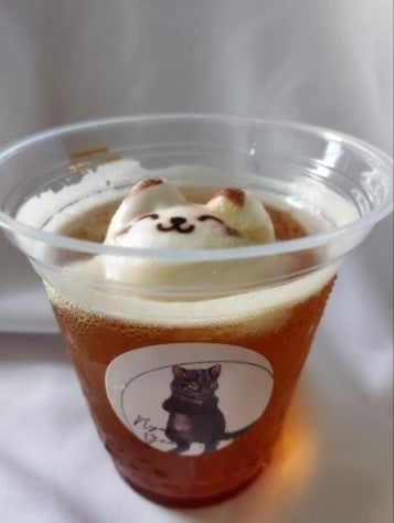 しゅわしゅわ冷たいティーソーダに、かわいい猫のマシュマロが乗っています。カップはオリジナルキャラクターのステッカー付き。