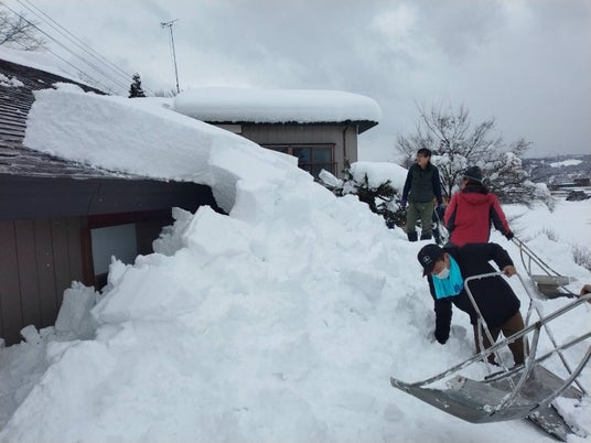 屋根から落下した雪がたまり過ぎて、屋根から雪が落ちない状態になり、みんなで雪下ろしをしています。