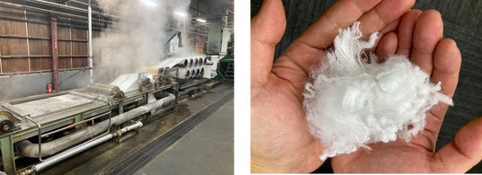 最終的にPET樹脂リサイクル繊維メーカーで再生ポリエステルファイバーへと加工。