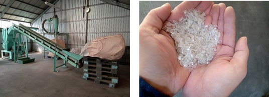 その後、回収したペットボトルは洗浄・破砕し、ペレット状に原料化。