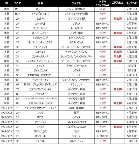仙台PARCO 2025年春 リニューアルショップ一覧