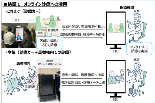 一方、診療カーに自力で乗車することが困難な患者(車いす利用、寝たきりなど)には、診療カーによるオンライン診療の提供が難しい状況にありました。そこで、自宅内に必要な機器を持ち込み、オンライン診療を実施するべく可搬型の機器の活用を模索してきました。